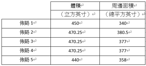 - 版面4與版面3相似,但外觀更為對稱(與版面3相同的體積和相同的周長)。
