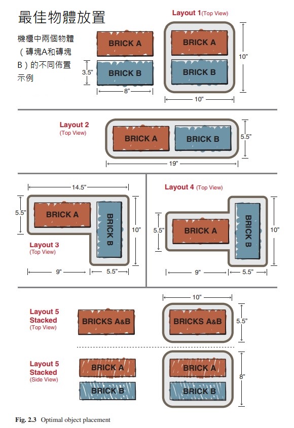 現在,假設我們設計的基本出發點是將兩個磚塊,磚塊A和磚塊B(尺寸相同)容納在一個封閉空間中。在開始時,我們沒有以下限制: