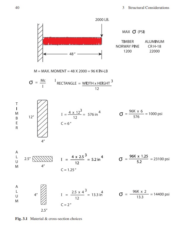 Determine the material and cross-sectional combination needed to support those forces (from Sect. 3.2.2), keeping in mind that “strength” is an inherent aspect that belongs to materials (so, the higher the yield strength of the material, the more loadbearing ability that material contains), and forces produce stresses in those materials. All materials have limits for maximum stress where we either have the start of deformation (yield strength) or complete failure point (ultimate strength). Maximum stress in the member is generally known by the “common equation” of