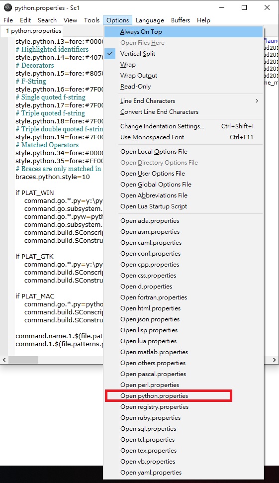 2.進入SciTE程式編輯器,點選options